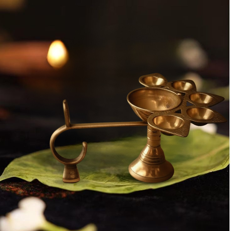 Enhance your daily puja rituals with this traditional brass Panch Aarti Diya. Featuring five beautifully carved flame holders and a sturdy handle for easy movement this diya is perfect for performing sacred aartis during festivals and daily worship. Crafted from durable brass with a polished finish it combines elegance with spiritual utilityâ€â€an ideal addition to every temple or spiritual space.