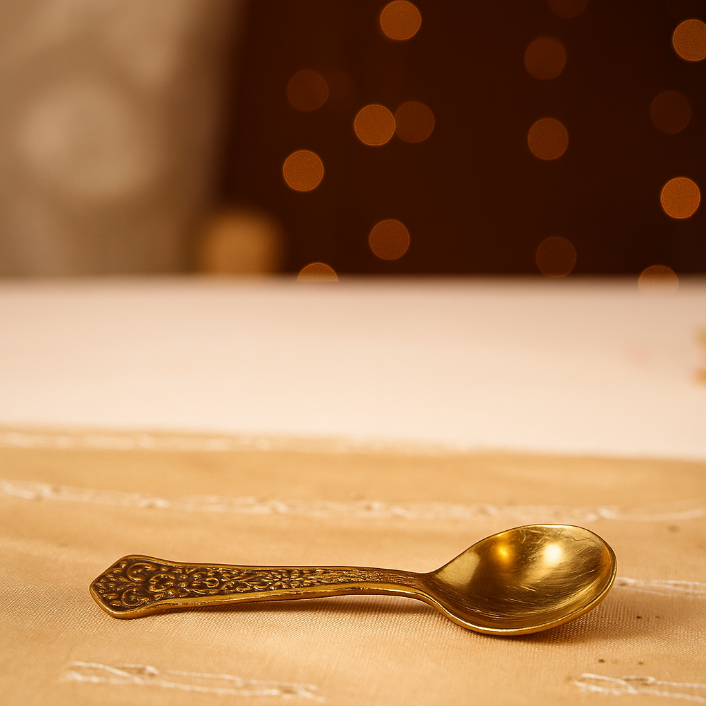 This elegant brass spoon is a perfect addition to your puja accessories or traditional kitchenware. With a beautifully engraved handle and polished finish it adds a touch of heritage to daily rituals or festive occasions. Durable and graceful it is ideal for offering serving or ceremonial use.